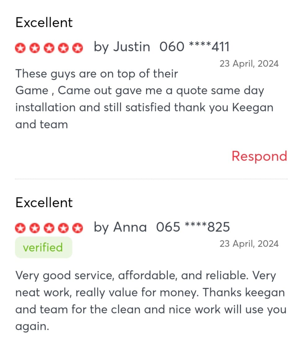 These guys are on top of their Game , Came out gave me a quote same day installation and still satisfied thank you Keegan and team.